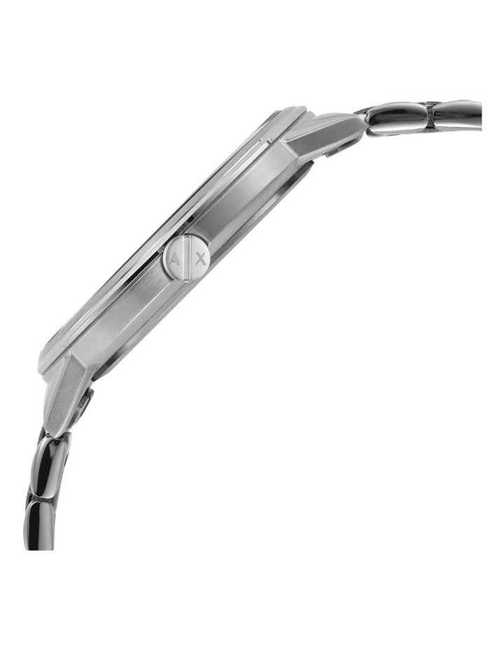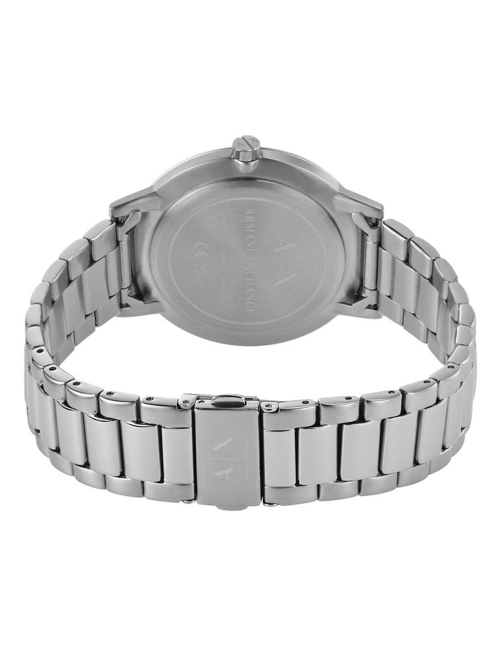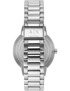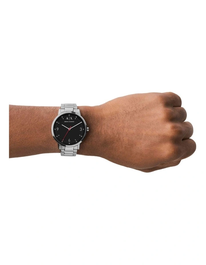 Armani Exchange’s 42mm watch features an at least 50% recycled stainless steel case, matte black dial, three-hand movement and stainless steel bracelet.