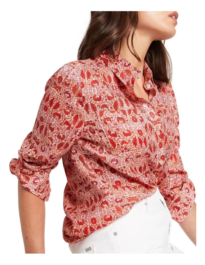 Soft and breathable in pure linen, this long sleeve shirt is simply perfect for summer, as it shows off a beautifully intricate print based in peach, pink and red. Offering a regular fit with curved shaping at the hem, the shirt fastens at the front with pearlescent pink buttons, with further detail found in patch pockets at the chest, and a button-tab to secure rolled up sleeves at the elbow.