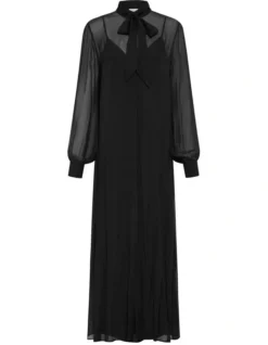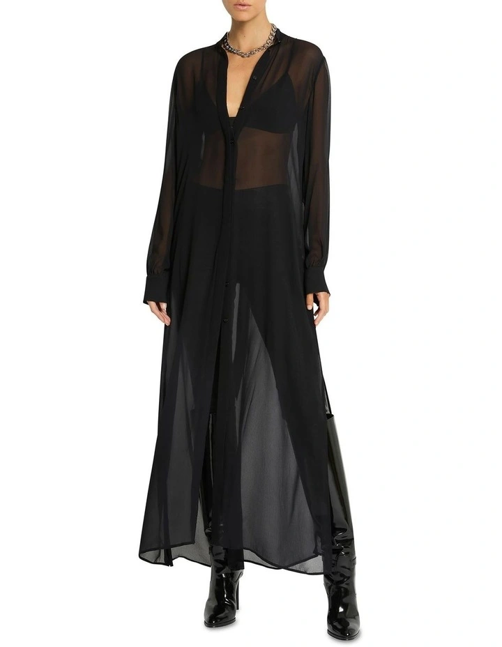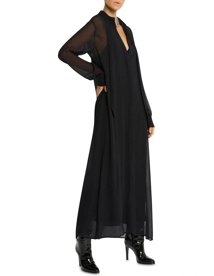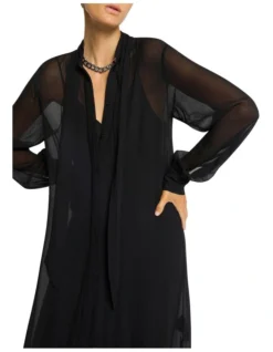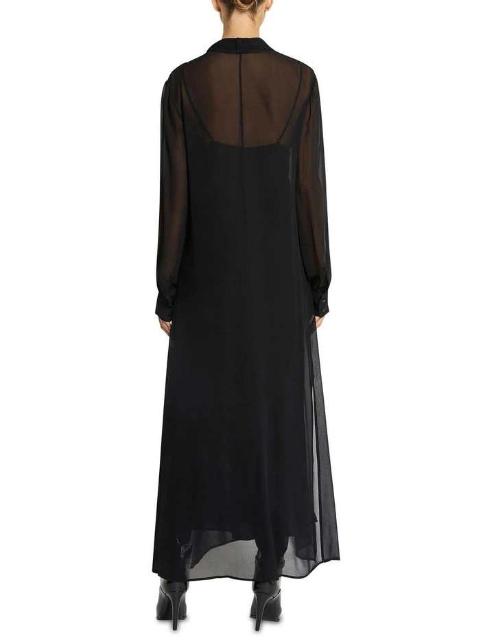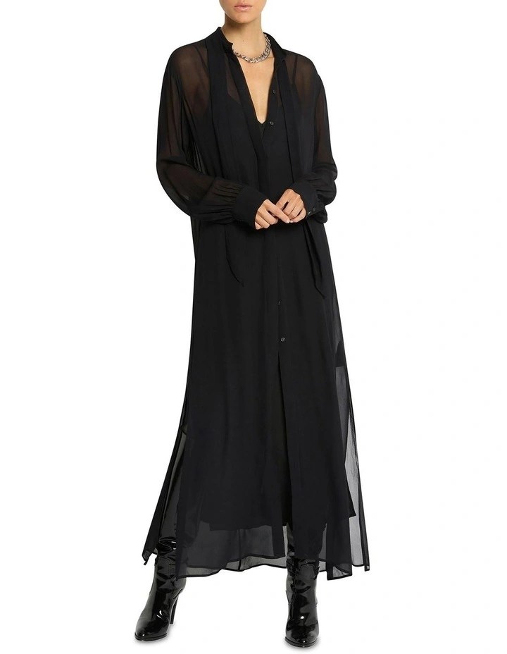 Lightweight and semi-sheer, this fabulously flowy shirt dress creates loose, floaty silhouette, beautifully accentuated by a draped removable neck tie that can be worn loose or tied in a pussybow. Rich black in colour, the dress descends to a voluminous maxi length, showing off additional detail in deep side seam splits, relaxed long sleeves and a concealed button front closure.