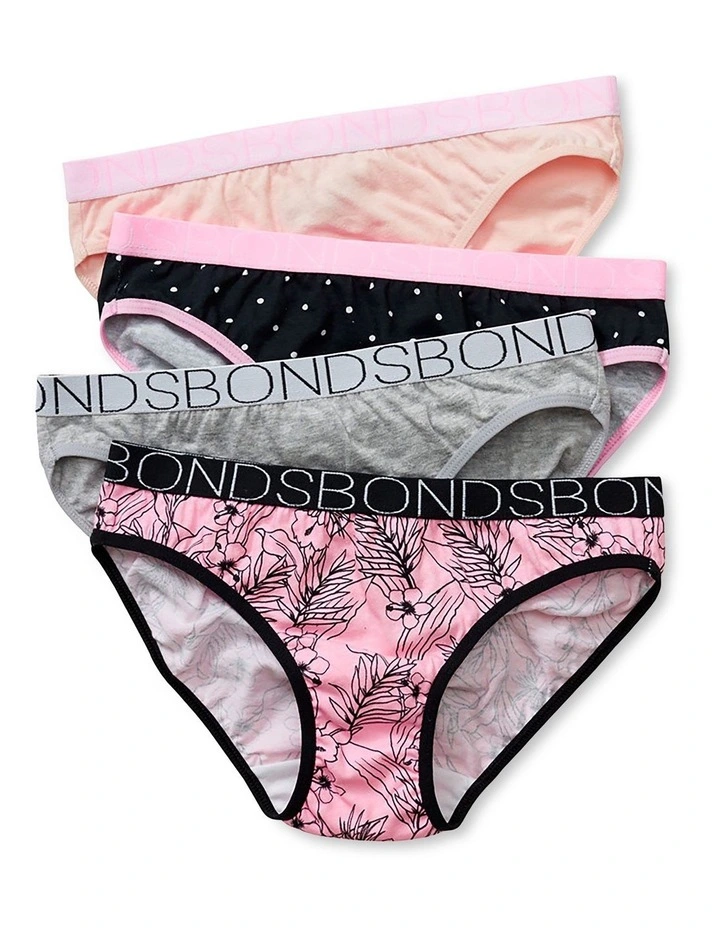 Let them get on with their day with our Bikini Multipack, made for comfy coverage every day. Designed from cotton, it features a Bonds branded soft elastic waistband and prefold elastics for the ultimate fit. In a range of fun prints and colours, our iconic Bikini is the go-to undie for your girl. Available in a handy four-pack.
