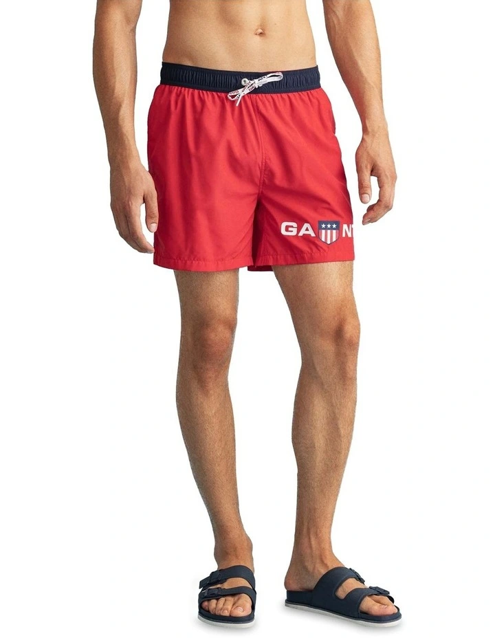 Crafted in recycled polyester, the Classic Fit Retro Shield Swim Shorts sport a classic length and feature an elastic waistband with a drawstring, front side pockets, and a back pocket with a velcro closure. These easy-to-wear and classic swim shorts have a mesh inner pant and a ’90s-inspired Retro Shield logo print at the left bottom leg.