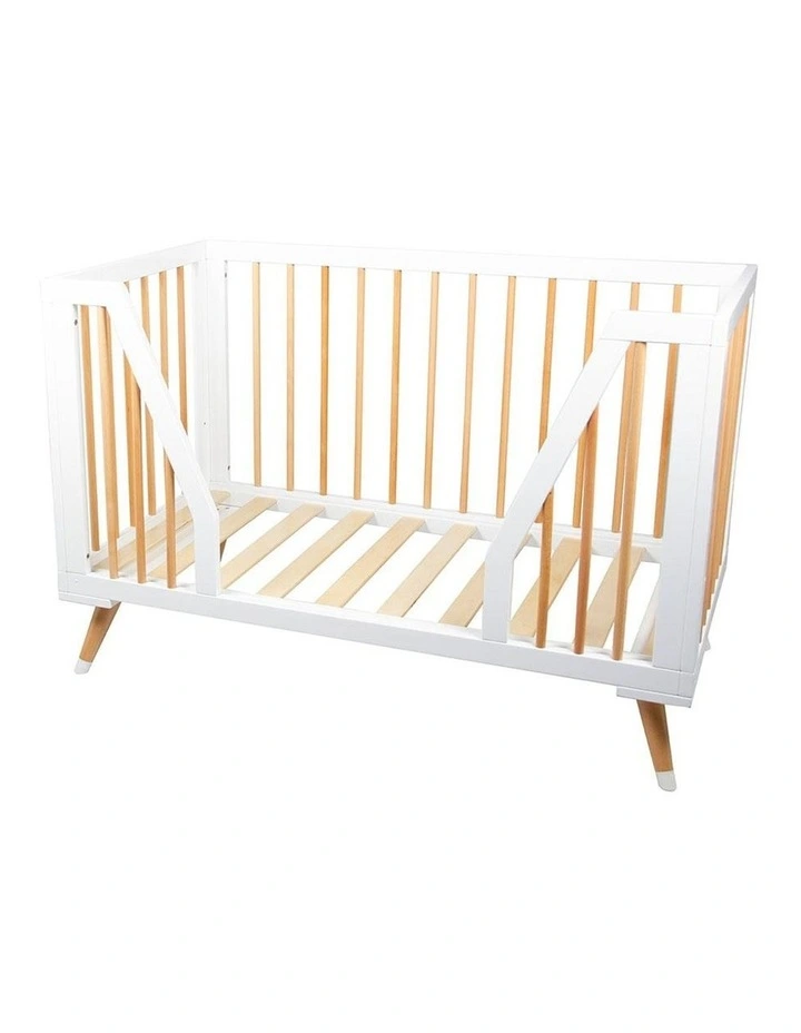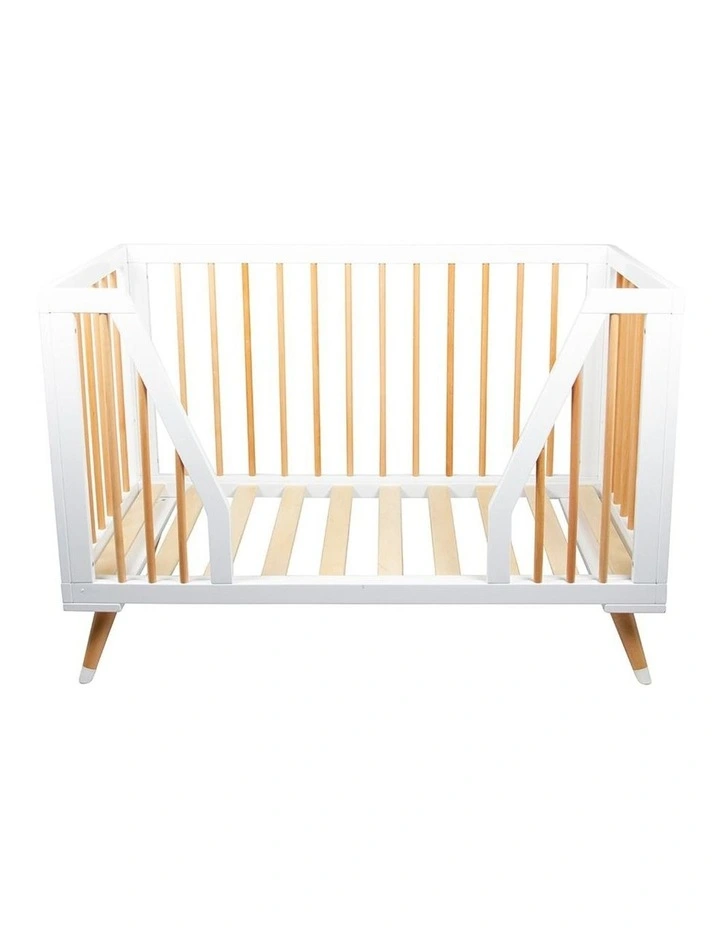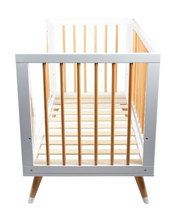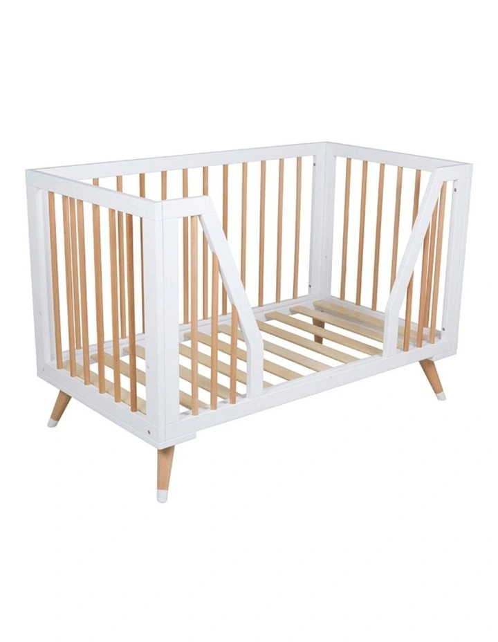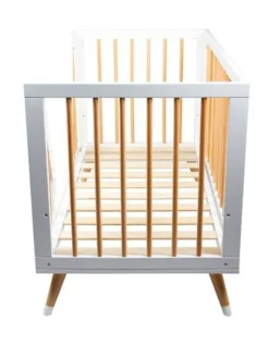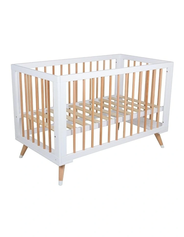 - Solid timber cot with fixed slat sidesAdjustable base height for a high or low positionNon-slip feetStylish Beechwood legs